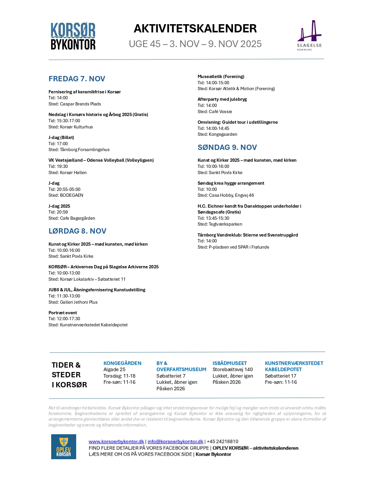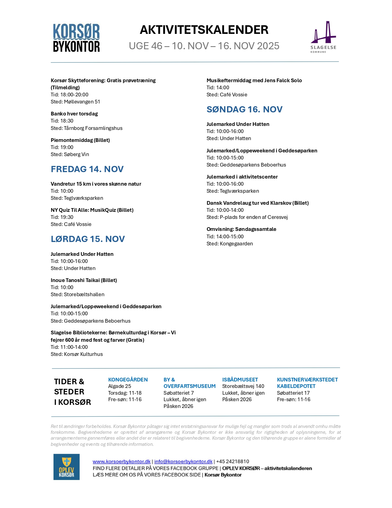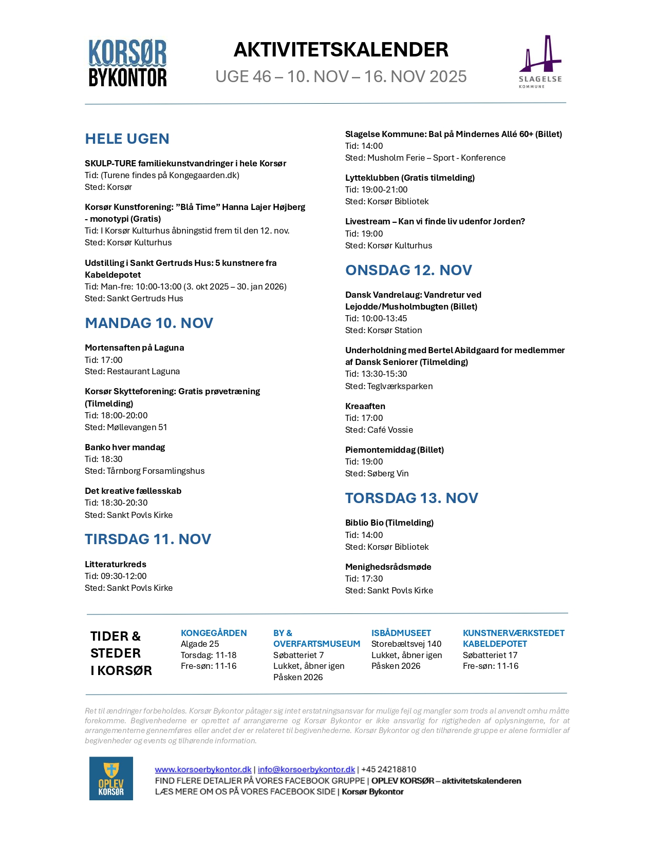 Her kan du se vores aktivitetskalender print fra OPLEV KORSØR – aktivitetskalenderen. Du er også meget velkommen til at komme forbi vores kontor og få en kopi.